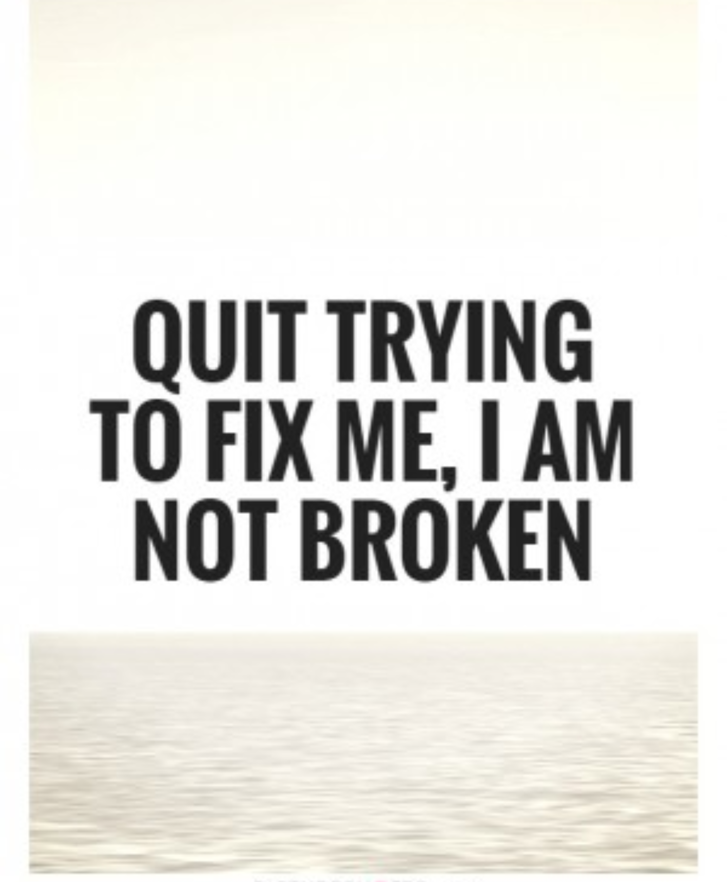 This quote should read “Quit trying to fix me, I am not broken… I’m am HEALED!” Because when you serve a GOD like I do, he Heals you from the inside out and makes you whole again. God will protect you, he will provide for you, he will never leave you nor forsake you! Don’t worry about what people will say about you, Don’t worry about what they will think about you, and Don’t worry about how they will feel about you.. just know that once they see you again, you will be Healed, you will need Happy, and you will be Content in what the Lord has done for you. This is only a be season of hurt and pain. You can do this! YOU can do anything you put your mind, time and attention too.